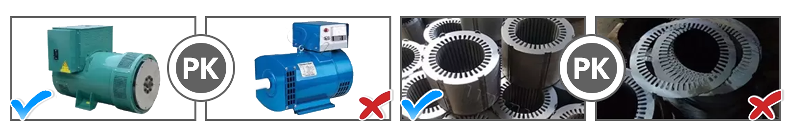 %100 bakır telli fırçasız alternatör veya orijinal STAMFORD alternatör. | Düşük kaliteli fırça alternatörü. | Yüksek kaliteli soğuk haddelenmiş silikon çelik sac kullanın | Düşük kaliteli sıcak haddelenmiş silikon çelik sac kullanın |
